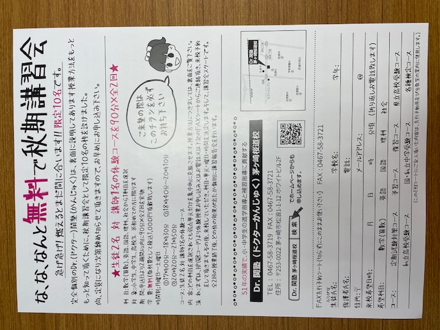 秋期講習会のお知らせです。このチラシを当校周辺の地域の皆様にお配りしております。体験授業90分を2回無料で受けられます。また、体験授業後に入塾されますとこの時期限定10名様まで、入学金が免除になります。是非、このチラシをお持ちになって教室にお出でください。お待ちいたしております。